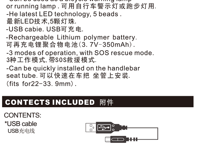 特性:LED技術(shù),5顆大燈珠,實(shí)現(xiàn)整體流暢設(shè)計(jì)和高亮照射;同時(shí)通過(guò)脈沖模式實(shí)現(xiàn)人性化設(shè)計(jì);配備USB接口,可循環(huán)充電;三種模式可循環(huán)切換,配有SOS模式;硅膠捆扎固定方式,方便拆卸安裝;方型背扣設(shè)計(jì),可橫向和縱向不同角度安裝;可安裝在坐管,車把手,前叉等。