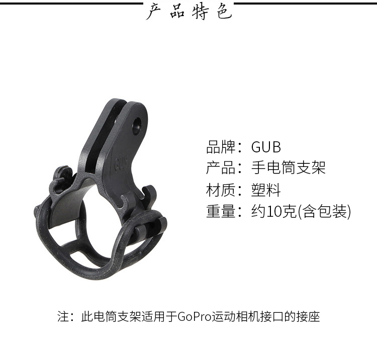 產品:GUB 自行車手電筒支架 材質:塑料(支架),硅膠(綁帶) 顏色:黑色 重量:約10克(毛重) 統(tǒng)一零售價:9.8元
