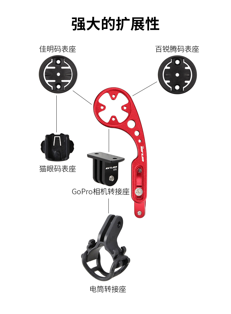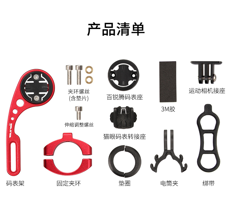 安裝在車把上,可伸縮設(shè)計,兼容佳明碼表,使用附帶的配件可兼容百銳騰碼表、貓眼碼表,另標配運動相機轉(zhuǎn)接頭和電筒轉(zhuǎn)接頭。