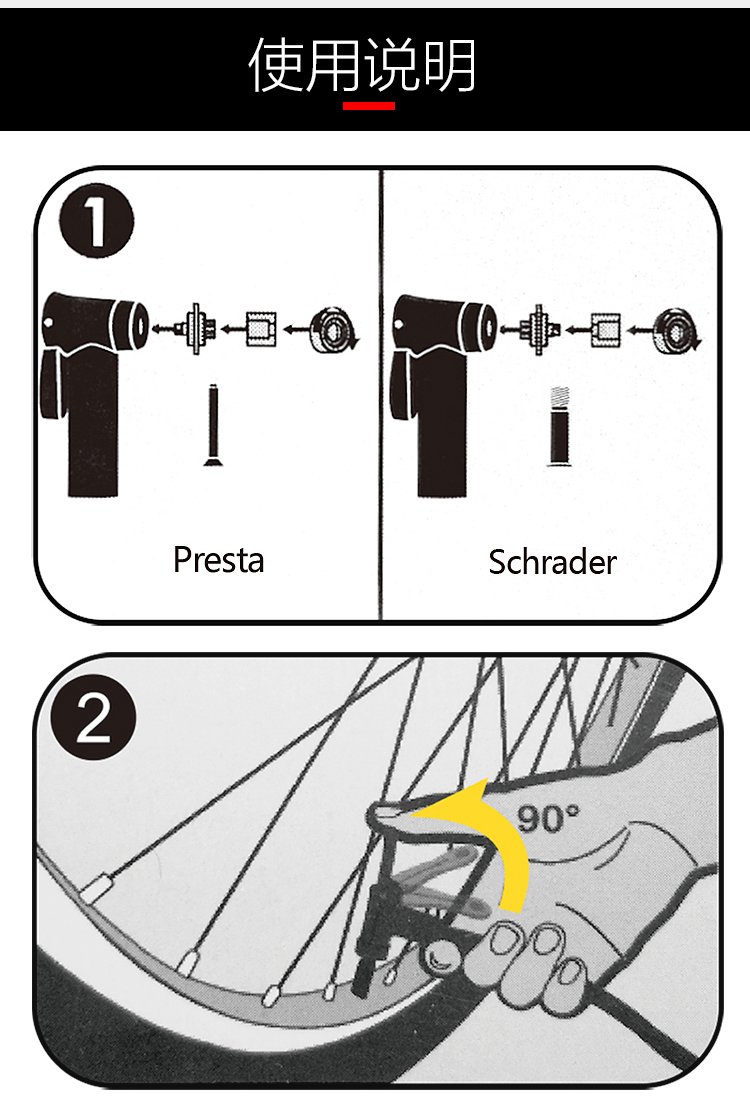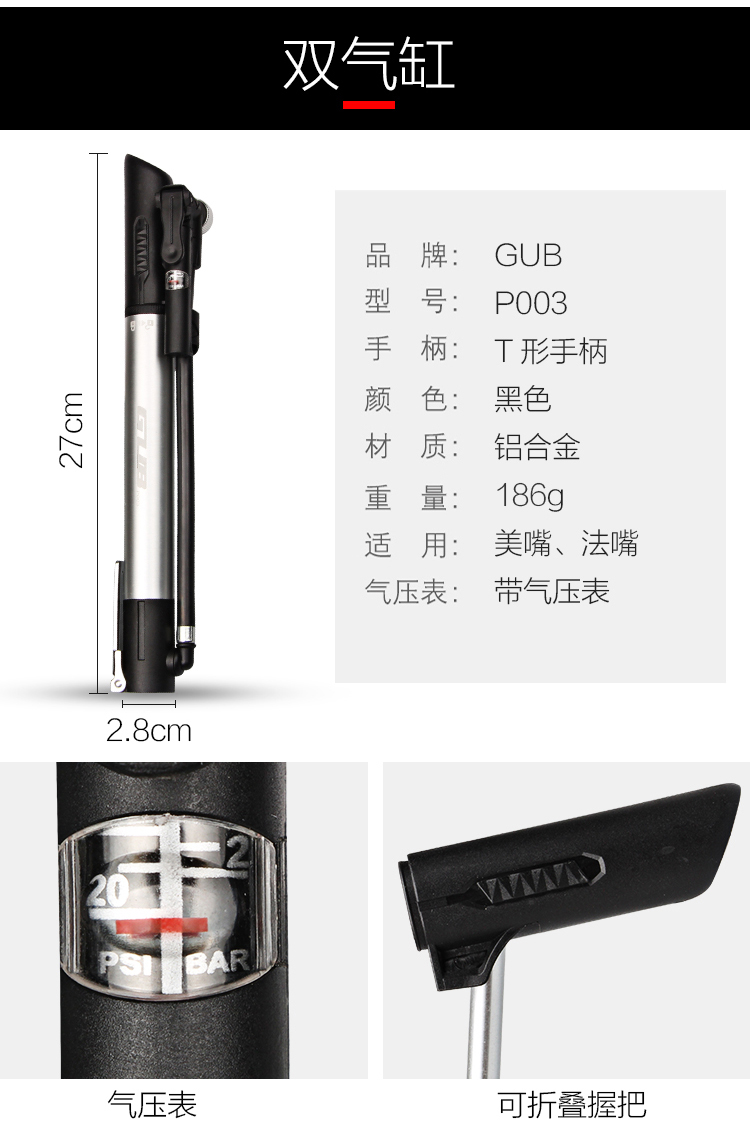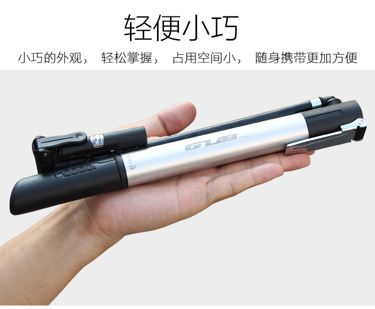 特點:鋁合金氣缸,體積小不占地方,美嘴法嘴兼用,帶固定支架可安裝在車架上