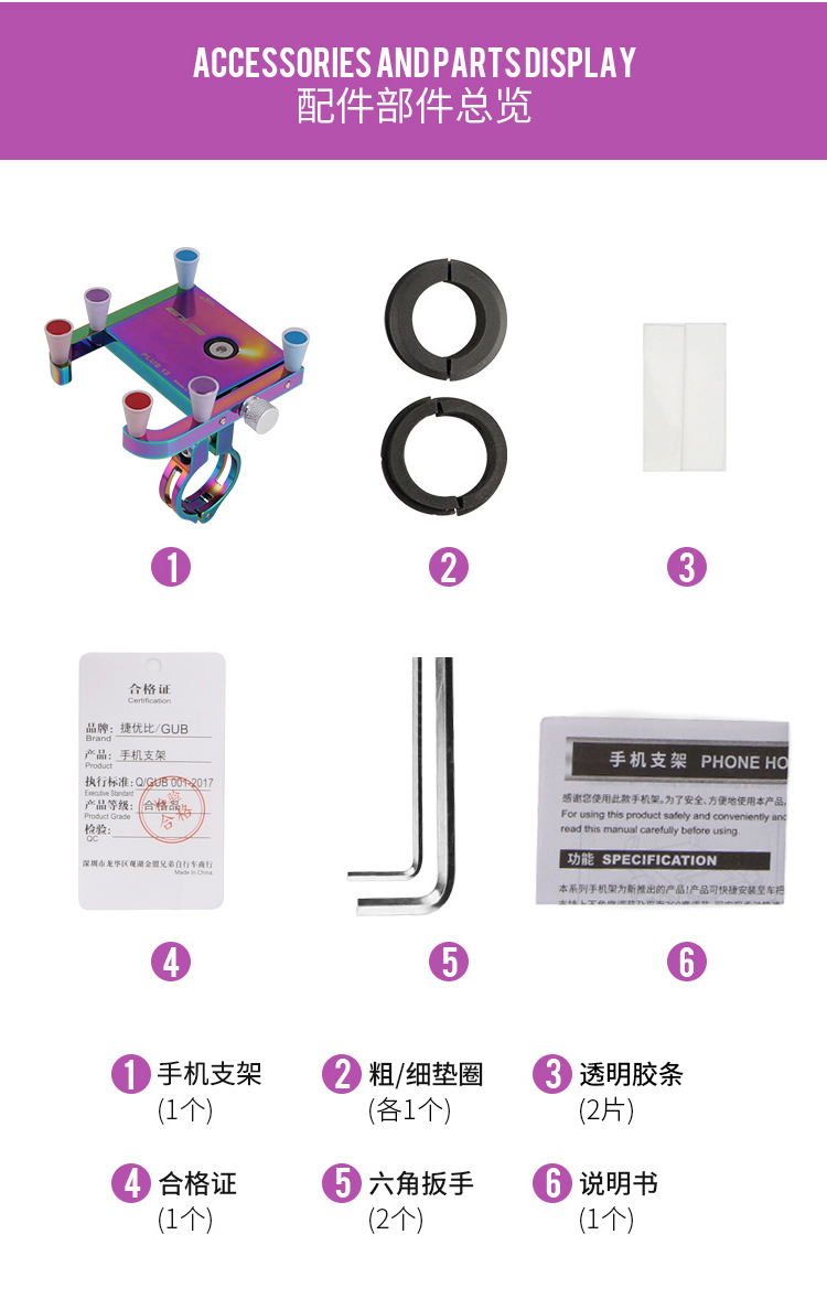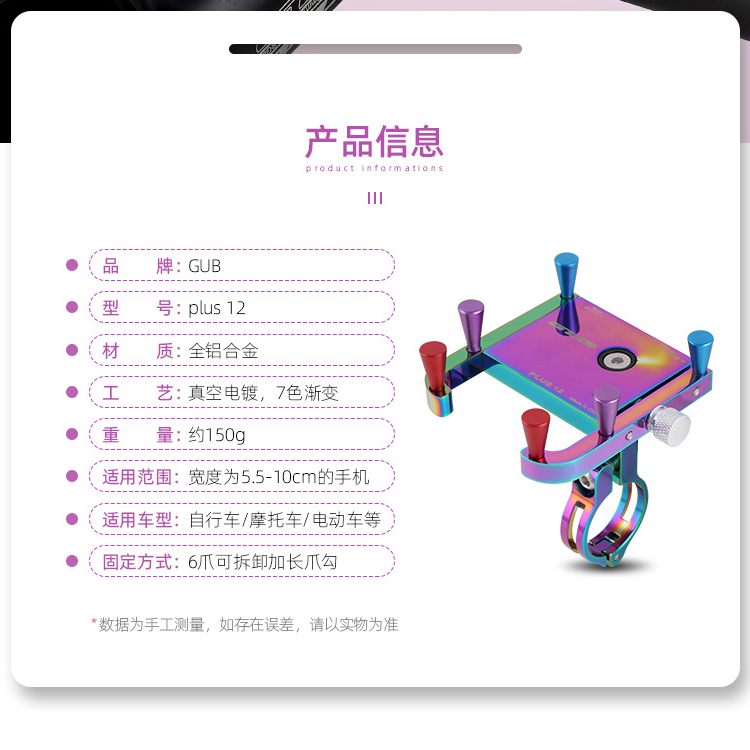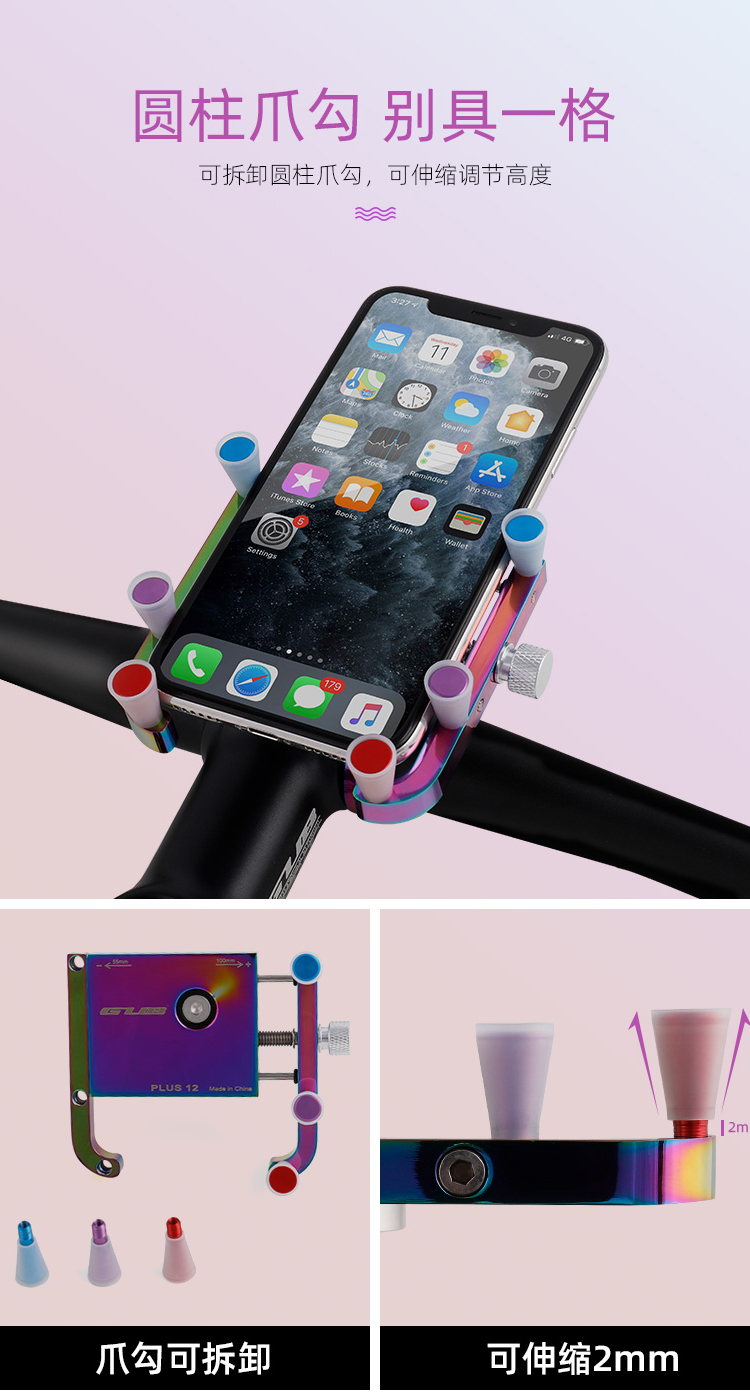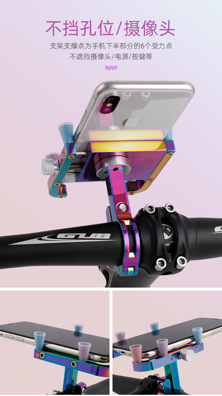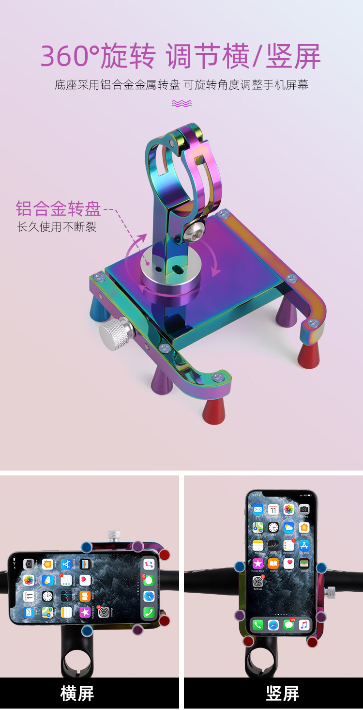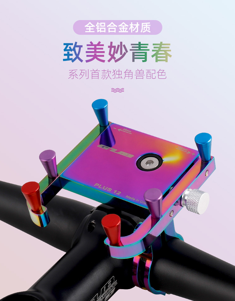 特點(diǎn):鋁合金架體,表面七彩電鍍工藝,帶來(lái)猶如夢(mèng)幻獨(dú)角獸般的觀感,高兼容性不挑手機(jī)型號(hào),自行車(chē)、電動(dòng)車(chē)等都可使用!