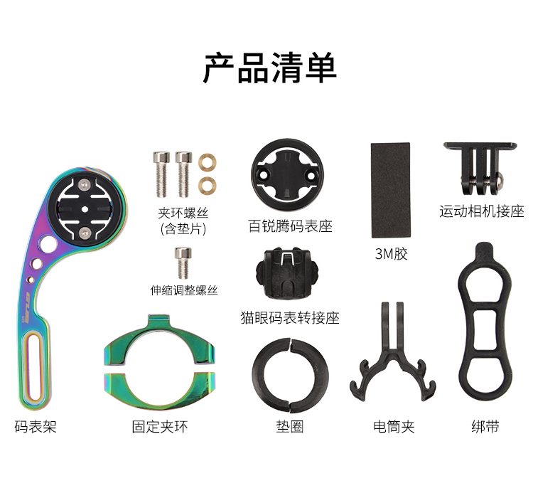 安裝在車把上,可伸縮設(shè)計(jì),兼容佳明碼表,使用附帶的配件可兼容百銳騰碼表、貓眼碼表,另標(biāo)配運(yùn)動(dòng)相機(jī)轉(zhuǎn)接頭和電筒轉(zhuǎn)接頭。