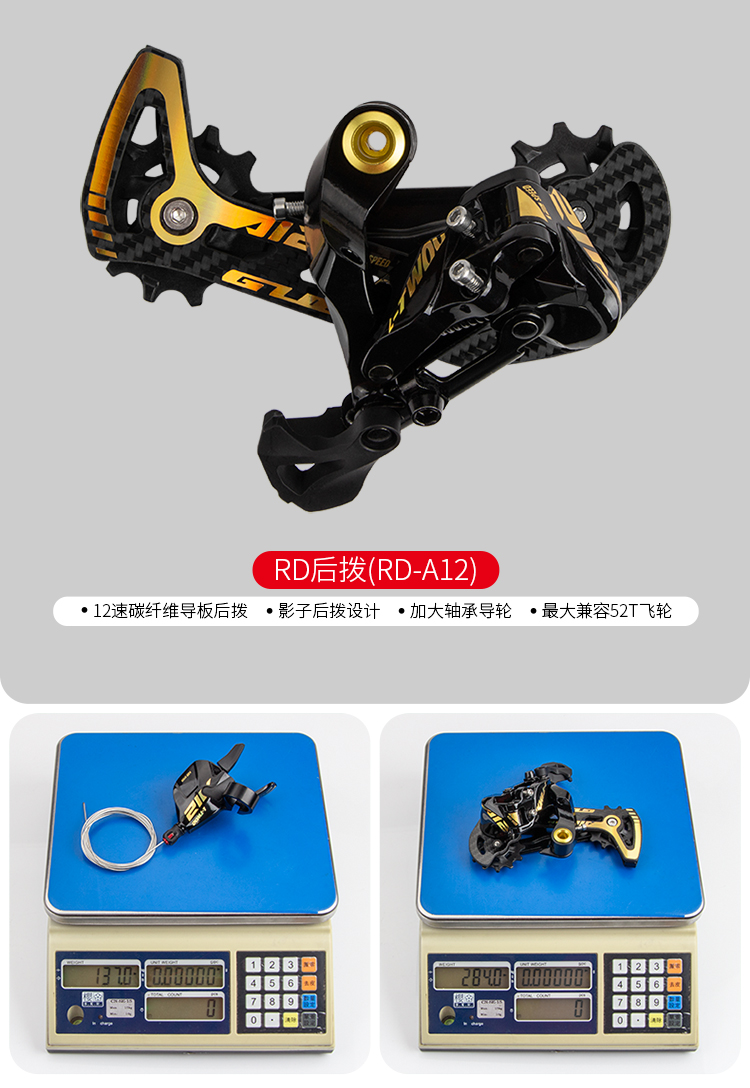 后撥:12速碳纖維導板后撥,影子后撥設計,加大軸承導輪,最大兼容52T飛輪