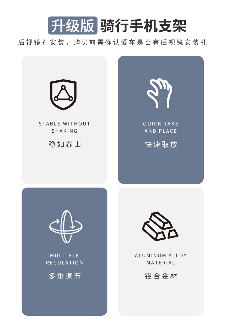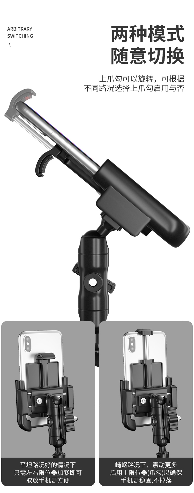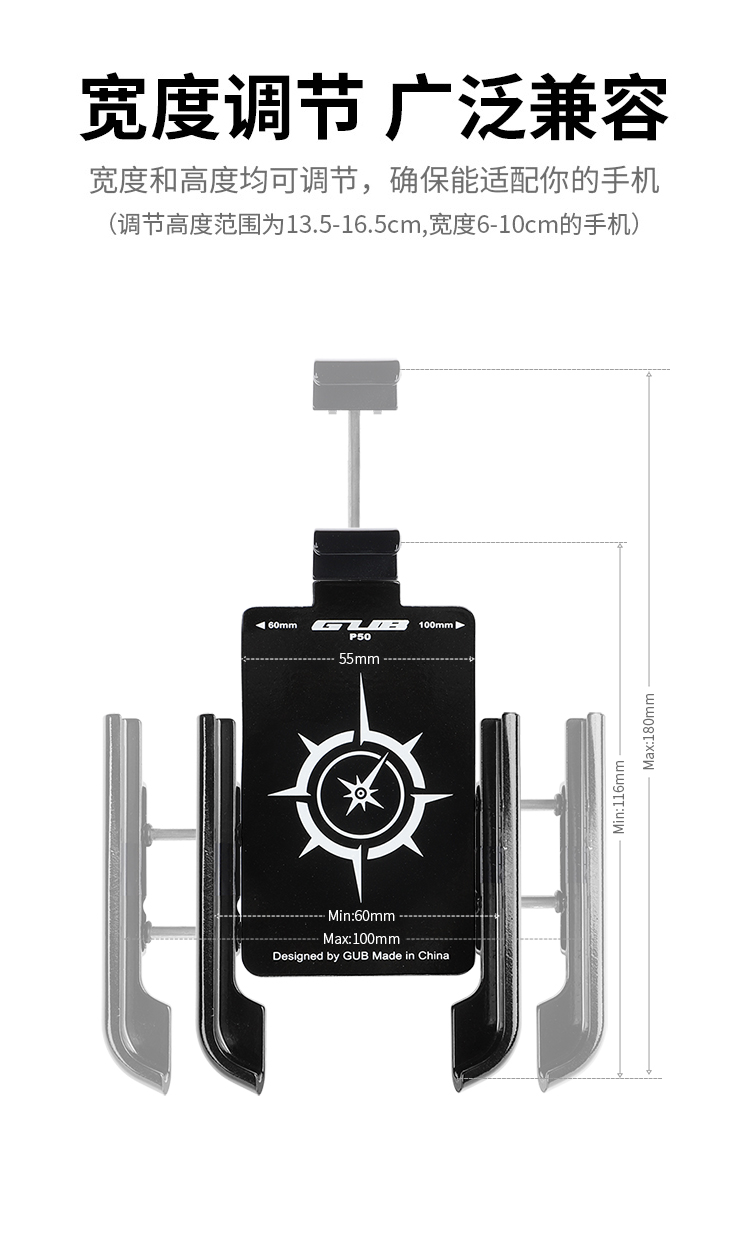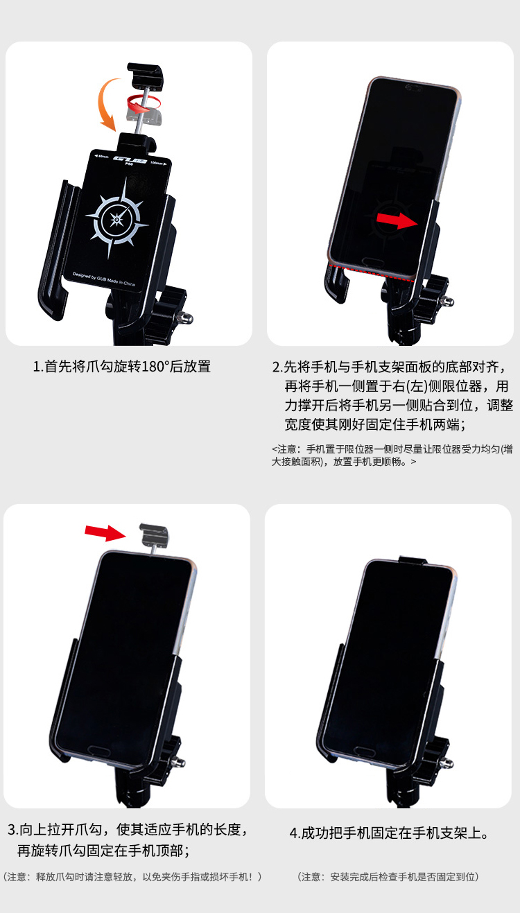 特點:鋁合金架體,高兼容性不挑手機型號,摩托車、電動車等都可使用,四面環(huán)繞固定,夾手機更牢固,快速取放省時省力,雙萬向球旋轉(zhuǎn)系統(tǒng),滿足多場景使用需求。