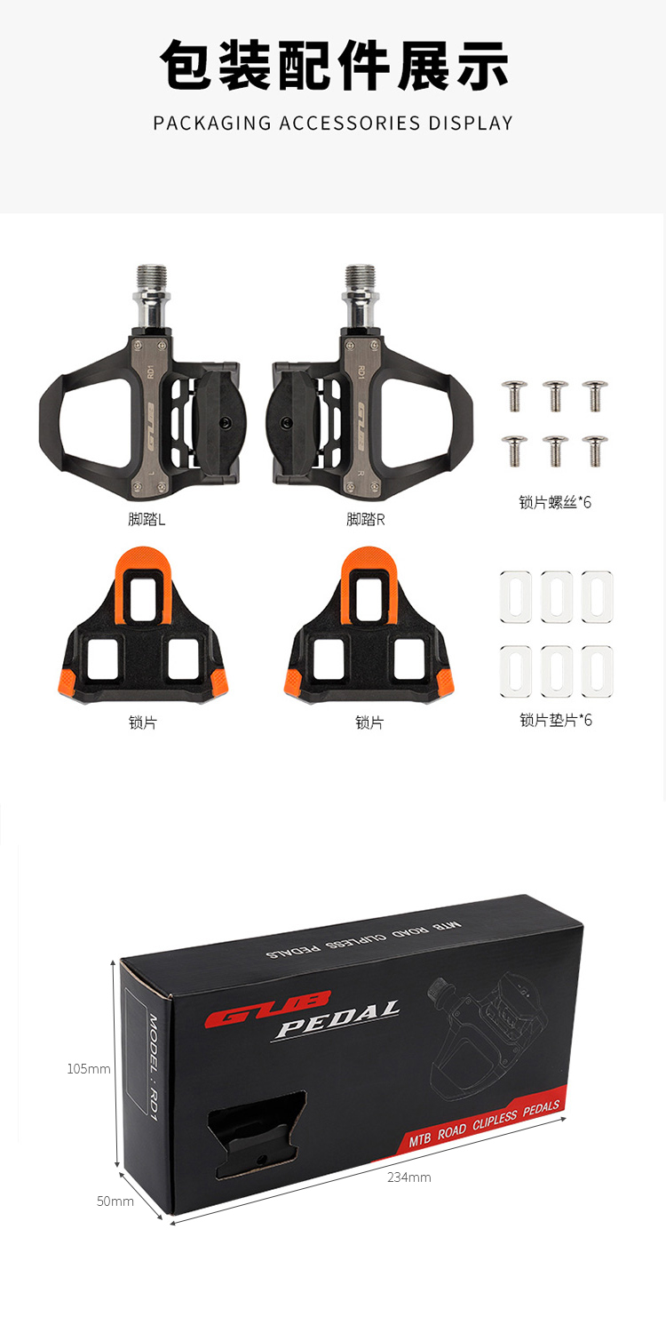 名稱:GUB RD1 公路車自鎖鎖踏 適用類型:公路車 材質(zhì):工程塑料+鉻鉬鋼軸心 重量:凈重約291克/對、毛重約462克 統(tǒng)一零售價:158元