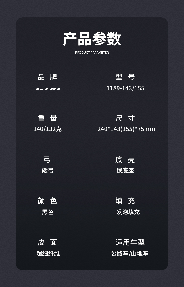 產(chǎn)品:GUB 1189-143/155 碳纖維短鼻坐墊