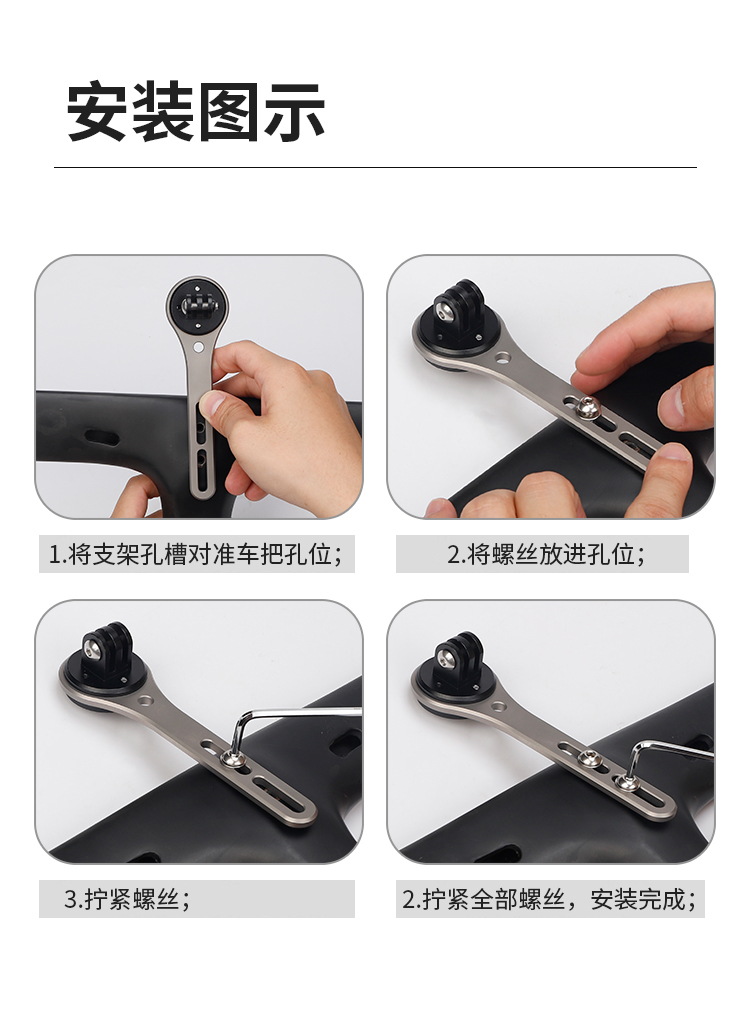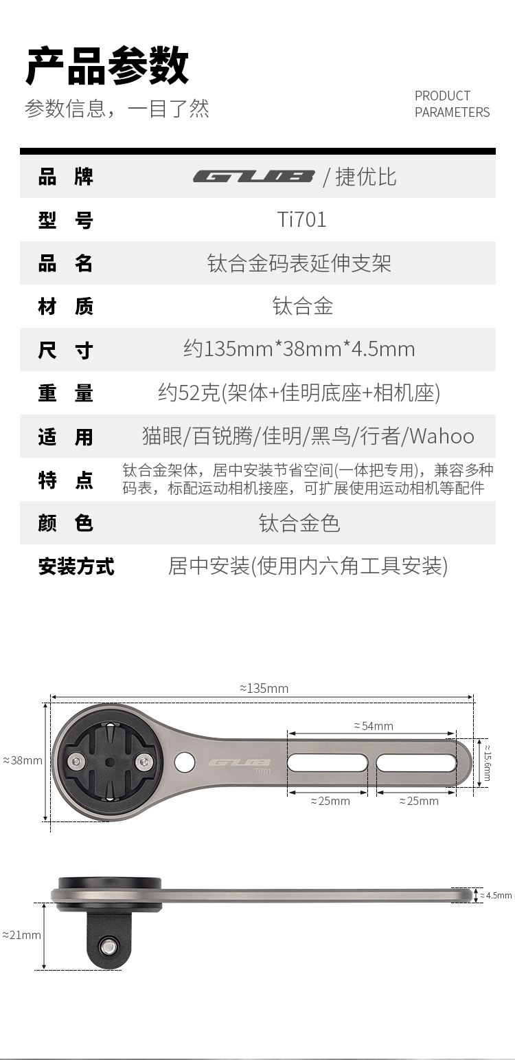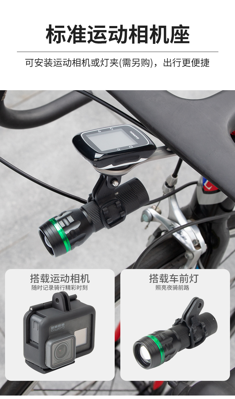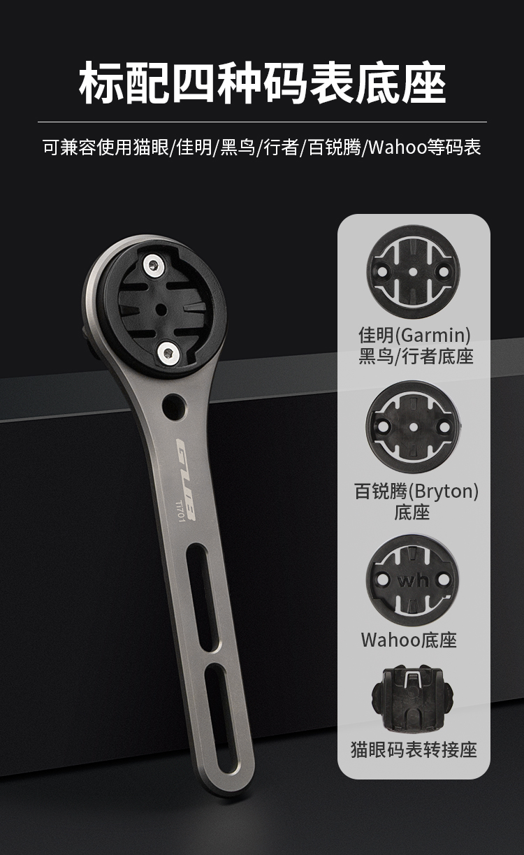 特點:鈦合金架體,居中安裝節(jié)省空間(一體把專用),兼容多種碼表,標配運動相機接座,可擴展使用運動相機等配件