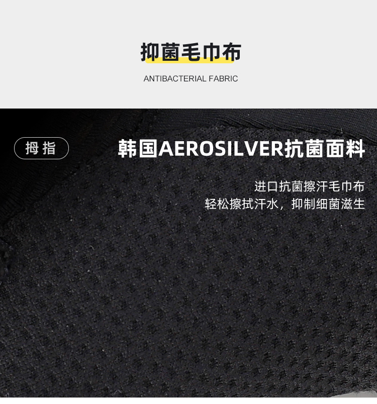 材質(zhì):高彈萊卡方格面料、進(jìn)口PORON XRD 緩沖掌墊、掌心采用韓國(guó)進(jìn)口PU、韓國(guó)Aerosilver抗菌面料(擦汗布)