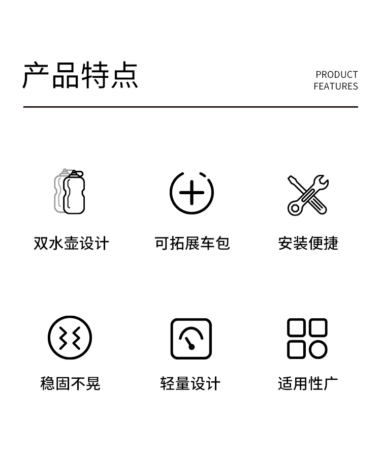 特點(diǎn):?jiǎn)?雙水壺架兩種模式,輕量化設(shè)計(jì),可拓展車(chē)尾包,安裝便捷