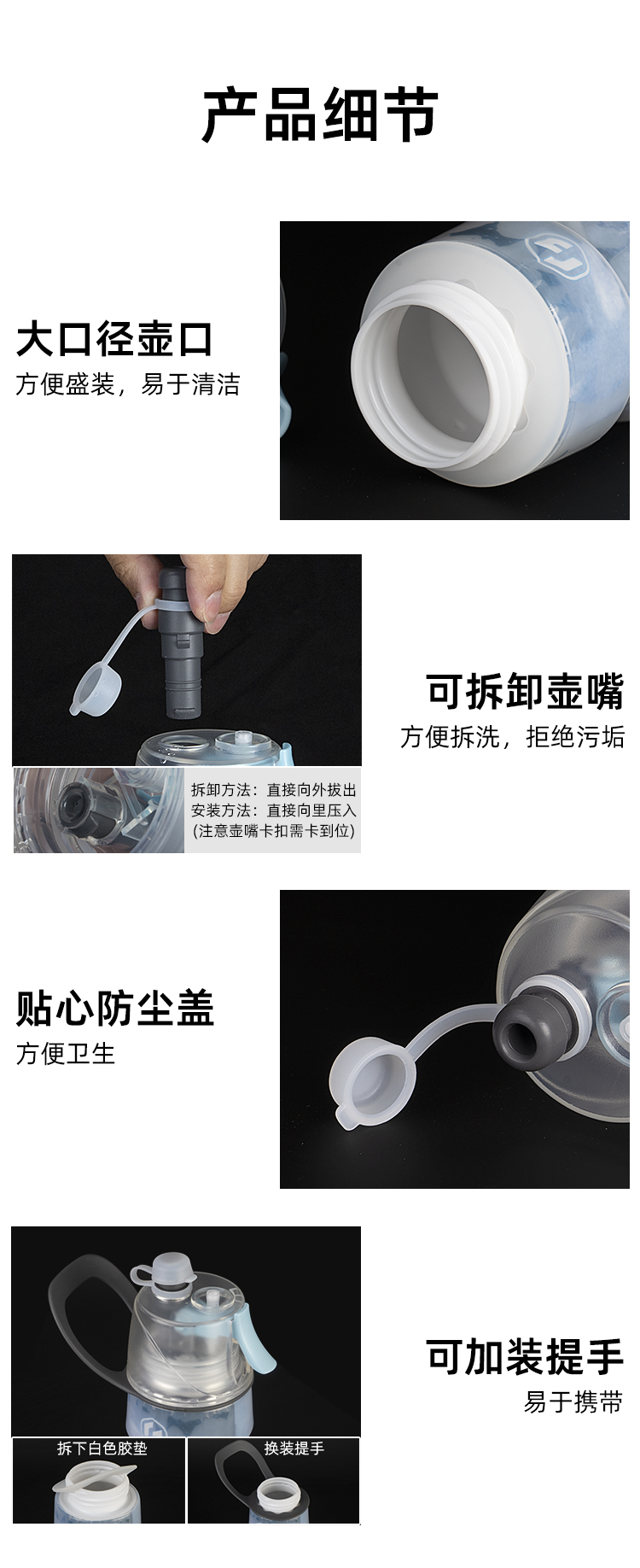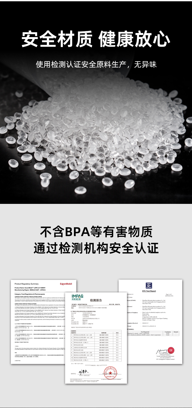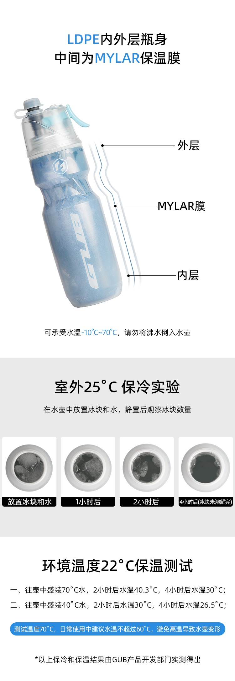 材質(zhì):外層內(nèi)層LDPE材質(zhì)、中間MYLAR隔熱膜、硅膠壺嘴、ABS壺蓋、PP噴霧按鈕