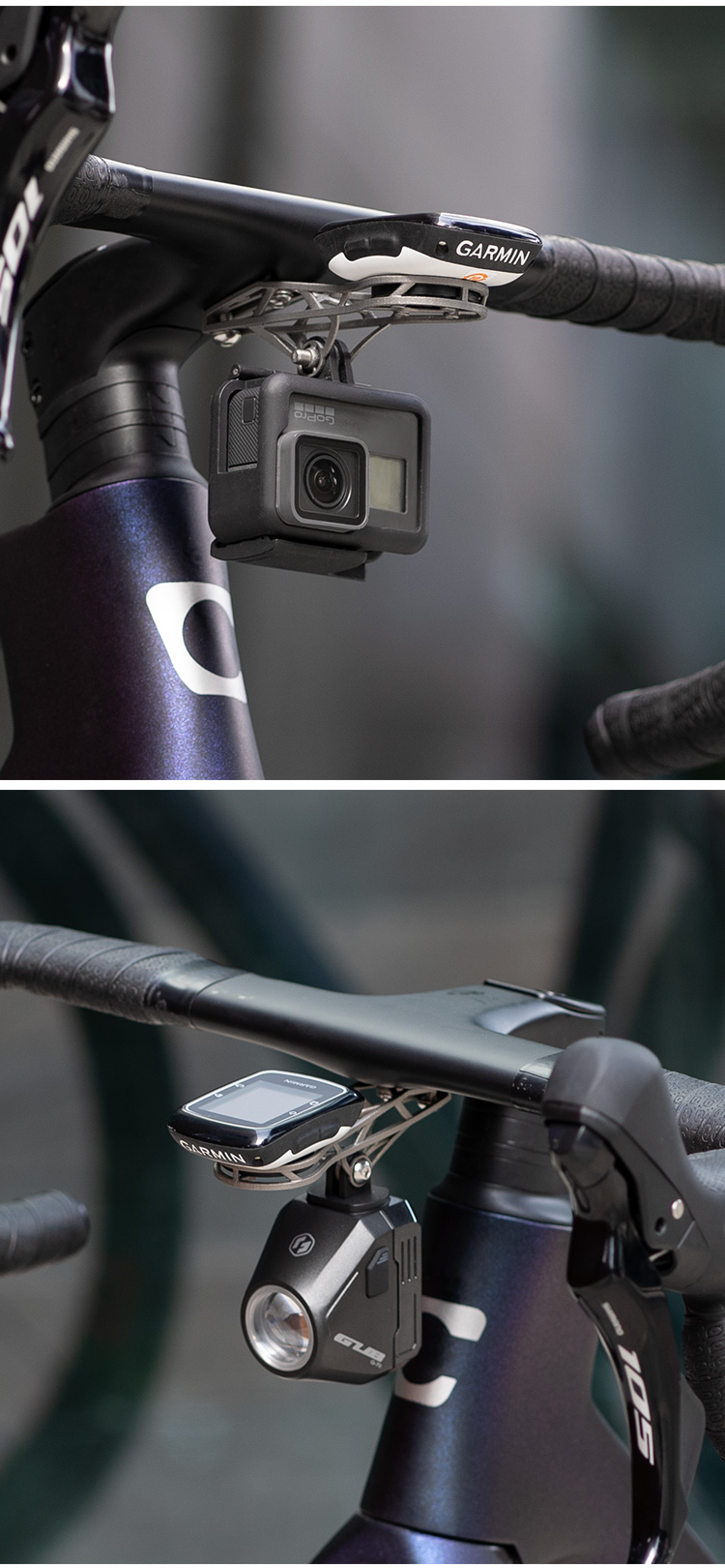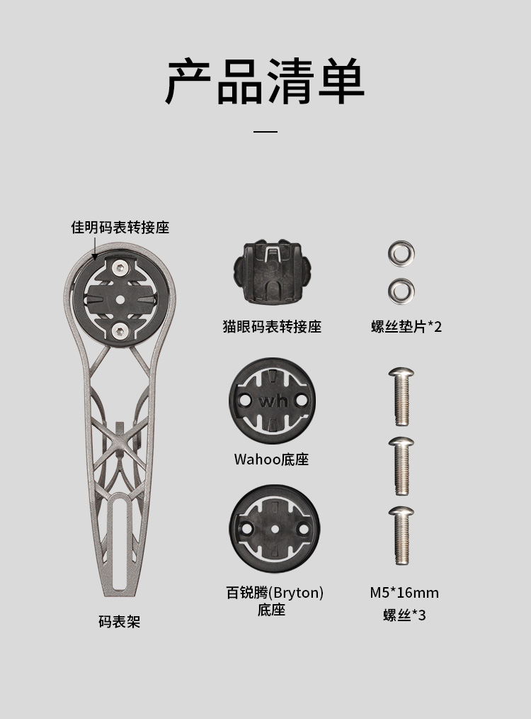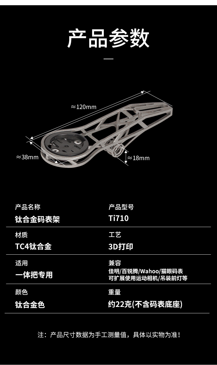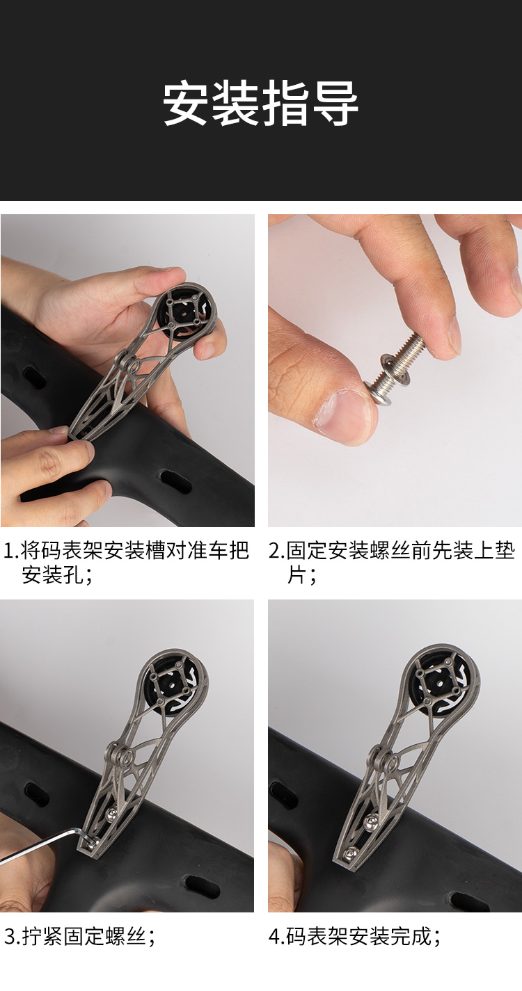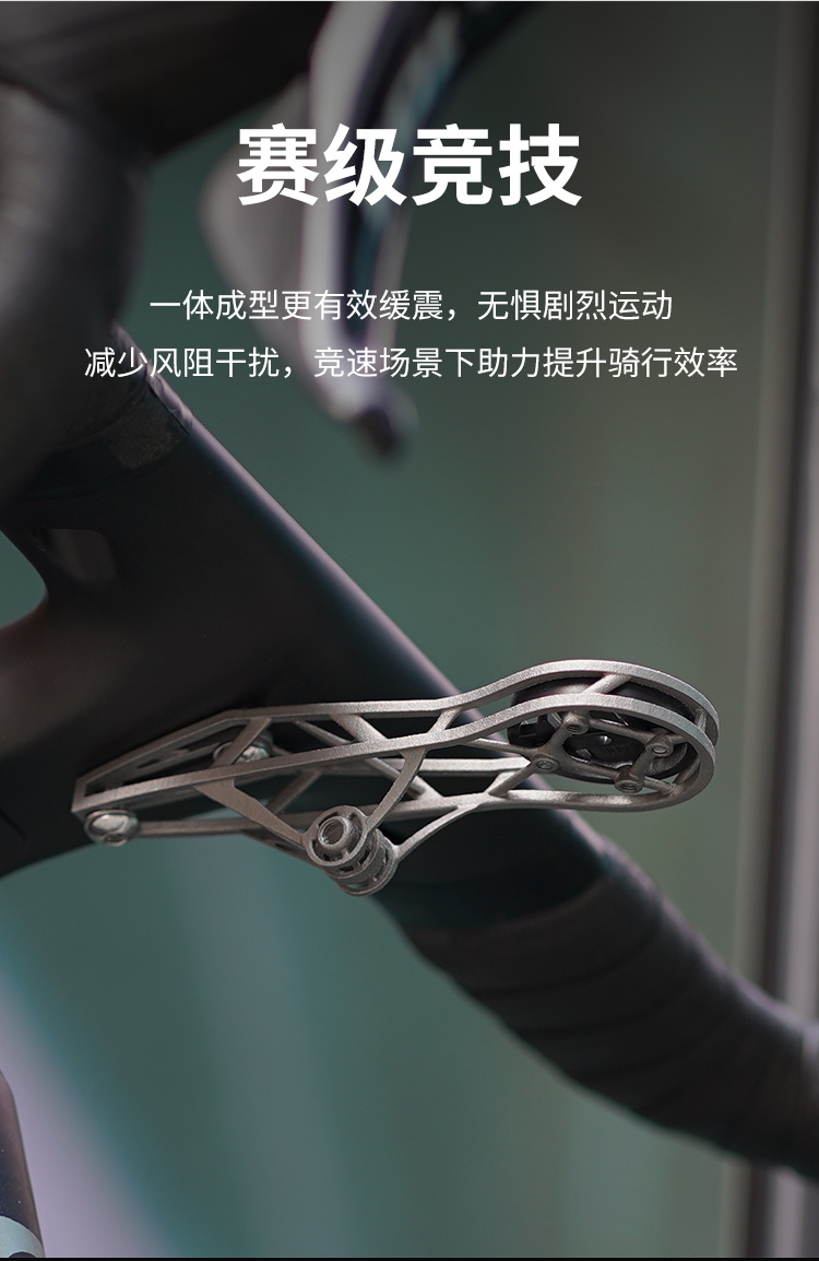 特點:鈦合金超輕架體,3D打印工藝,居中安裝節(jié)省空間(一體把專用),兼容多種碼表,標(biāo)配運動相機(jī)轉(zhuǎn)接座,可擴(kuò)展使用運動相機(jī)等配件